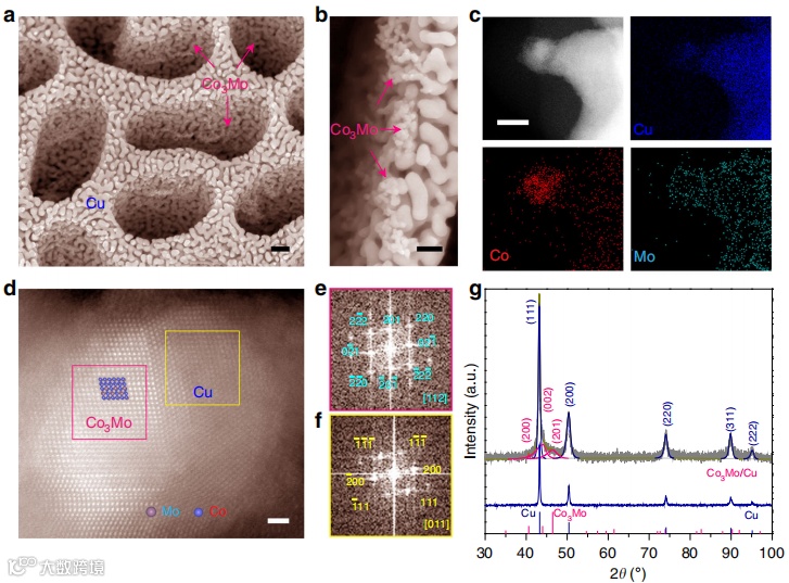 图1d显示了具有代表性的HAADF-STEM图像 金属Co3Mo纳米粒子原位生长在Cu韧带上,其相应的快速傅里叶变换(FFT)模式证明了这一点(图1e,f)。