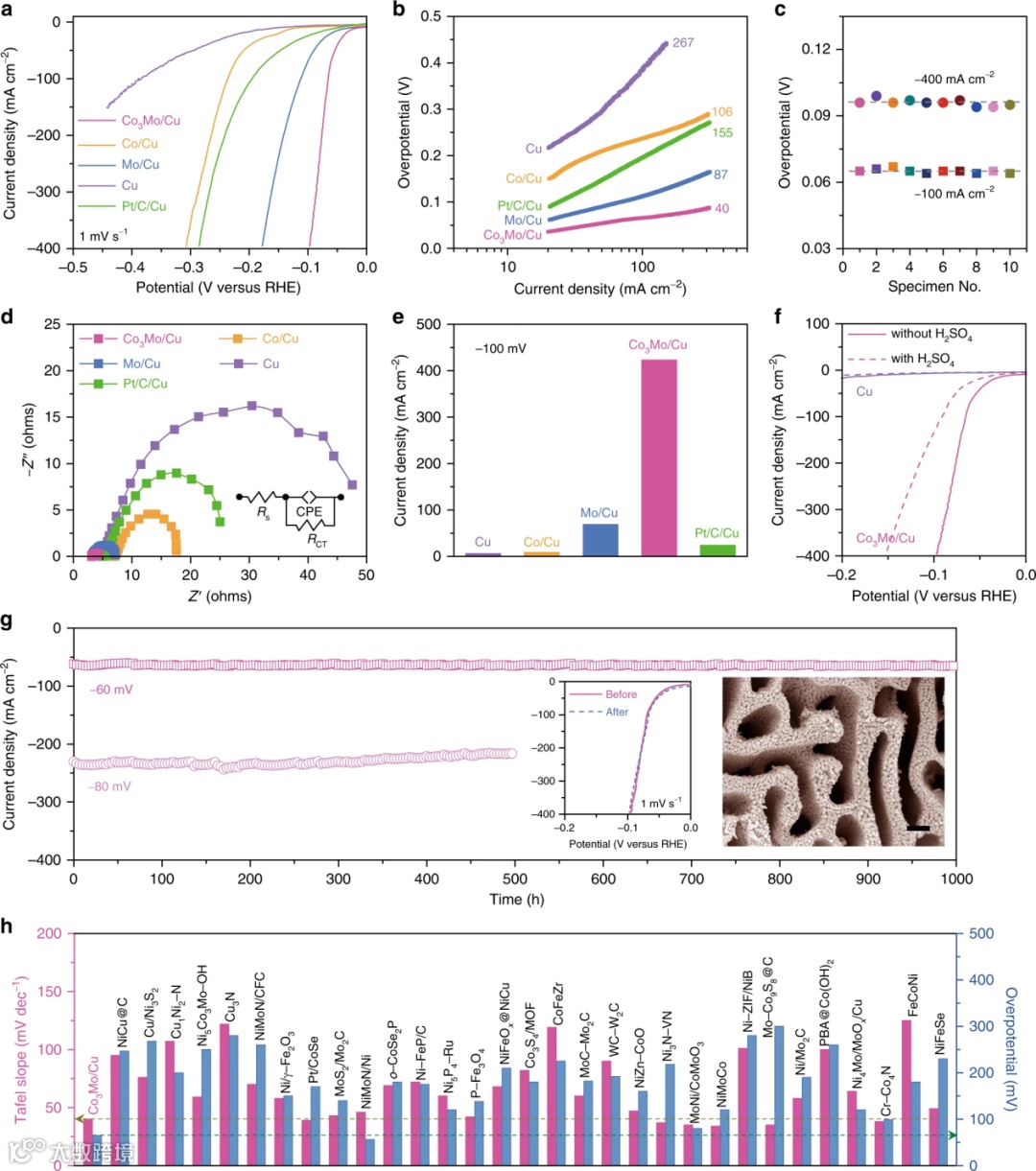 与最先进的过渡金属化合物和合金相比,纳米多孔Co3Mo/Cu电极是最好的非贵金属电催化材料之一(图3h)。