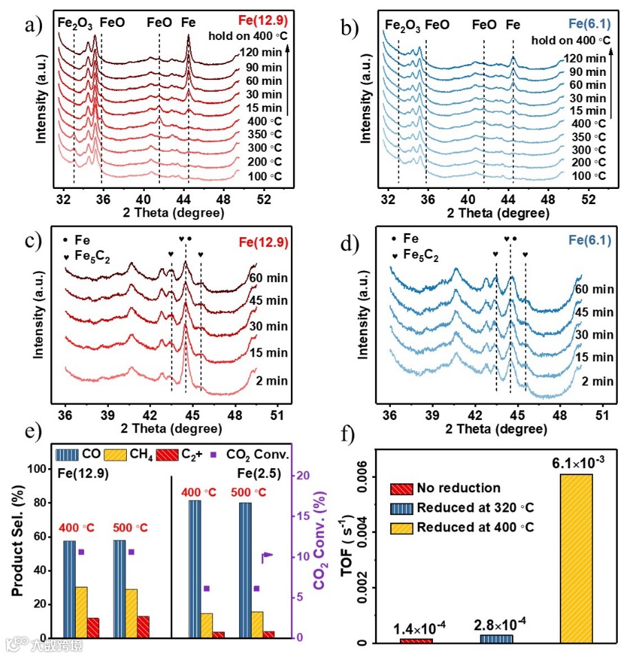 c, d) 还原后的Fe(12.9)和Fe(6.1)在CO2加氢中的原位XRD图谱;