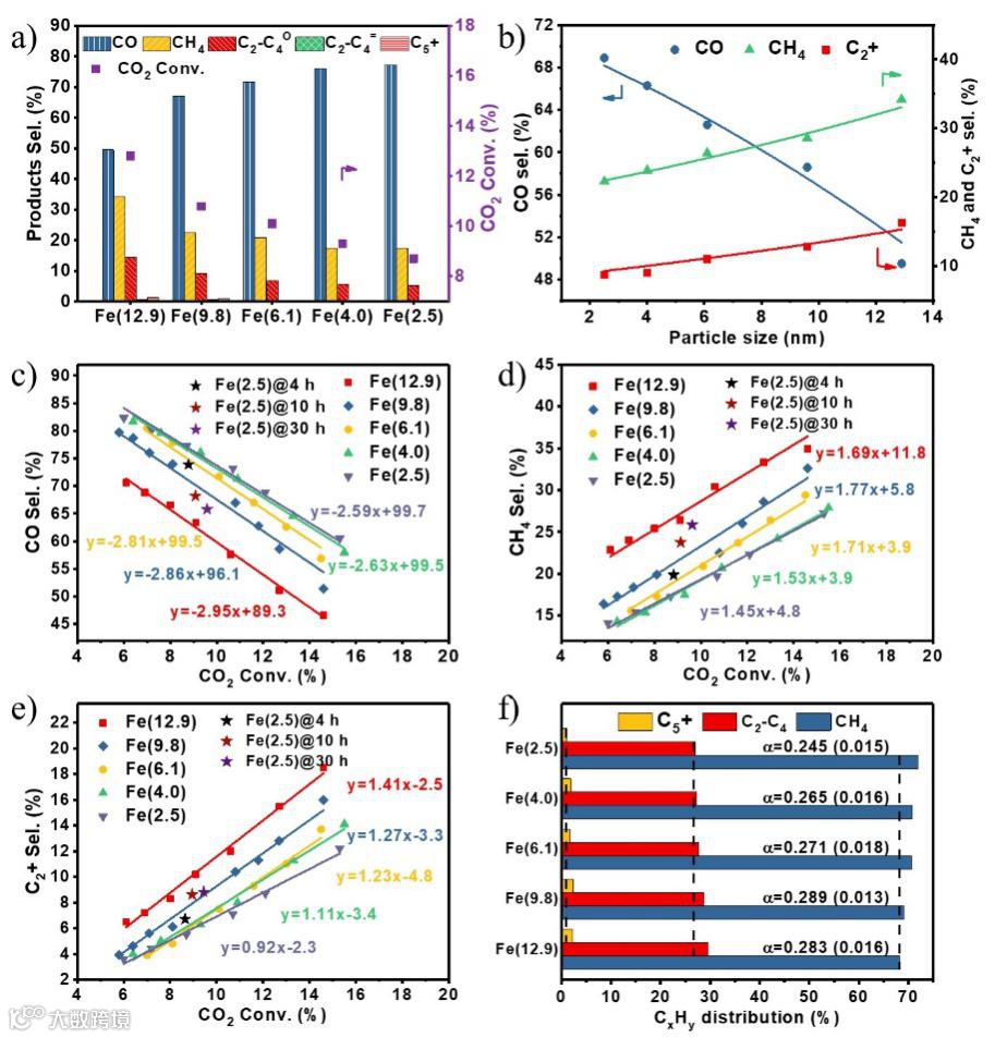 在相同的反应条件下,随着Fe粒子从2.5nm增加到12.9nm,co2的转化率不断提高,C2+烃产物的选择性增加。当转化率为13%时,随着粒径的增大,副产物的co选择性由69%下降到49%,甲烷选择性由22%上升到34%,C2+烃选择性由9%上升到16%(图2a-b)。当转化率为0时,CO和甲烷的选择性大于0,C2+接近于0,说明CO和甲烷是二氧化碳直接转化的主要产物。随着转化率的增加,CO的选择性降低,甲烷和C2+的选择性增加,说明生成的CO可以继续转化为甲烷和C2+(图2c-e)。