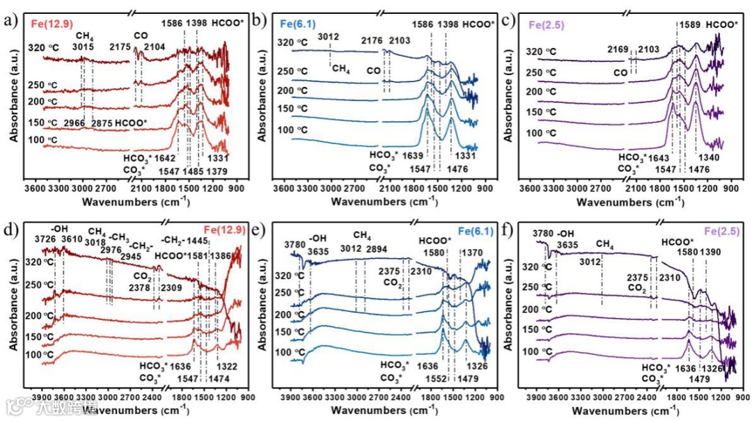 该工作进一步探究了颗粒尺寸影响初级反应和次级反应的原因。原位漫反射红外光谱(DRIFT)表明,初级反应中Fe(12.9)上更容易生成HCOO*物种和发生甲烷化反应;Fe(6.1)和Fe(2.5)在反应温度下仍存在较多的HCO3*和CO3*物种(图3a-c)。次级反应中,Fe(12.9)在反应温度下可以观察到更多的CH3和CH2基团,以及更多的水和含氧化物中的-OH,这与之前大颗粒上有利于发生次级反应是一致的(图3d-f)。