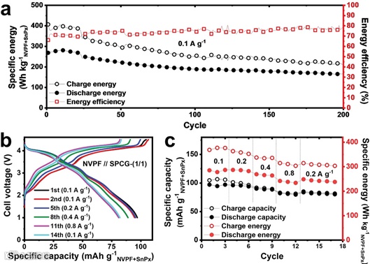 然而,高负荷8mg cm-2的n-NVPF表现出418 Wh kg-1NVPF,在0.05 A g-1时具有90%的能量效率;值得注意的是,当质量负荷从1增加到8mg cm-2时,能量密度损失仅为8%。因此,作者认为n-NVPF的良好动力学可适用于300 Wh kg-1的NVPF//SnPx全钠离子电池。由于容量很大程度上不平衡,需要大于8 mg cm-2的高质量负载。