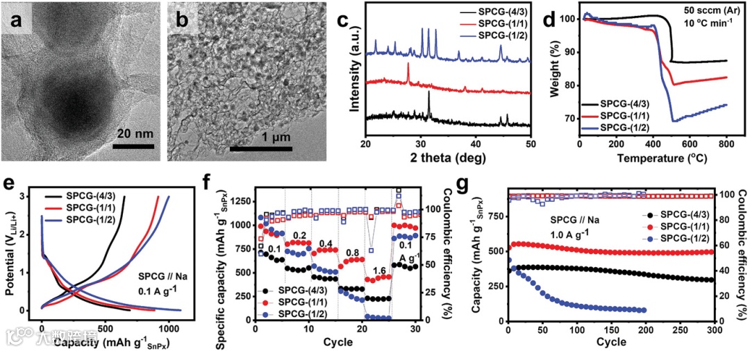 为了改善负极不利的动力学特性,作者采用改进的化学气相沉积(CVD)方法,实现了Sn/P比例精确控制、纳米结构稳定的高动力学SnPx/C复合材料的制备。获得的SnPx@C/RGO(SPCG)复合材料具有纳米结构,其中SnPx@C核-壳嵌入RGO片的层间空间(图2a,b)。为防止反应过程中纳米Sn颗粒在高于其熔点的温度下团聚,采用了碳壳涂层。
