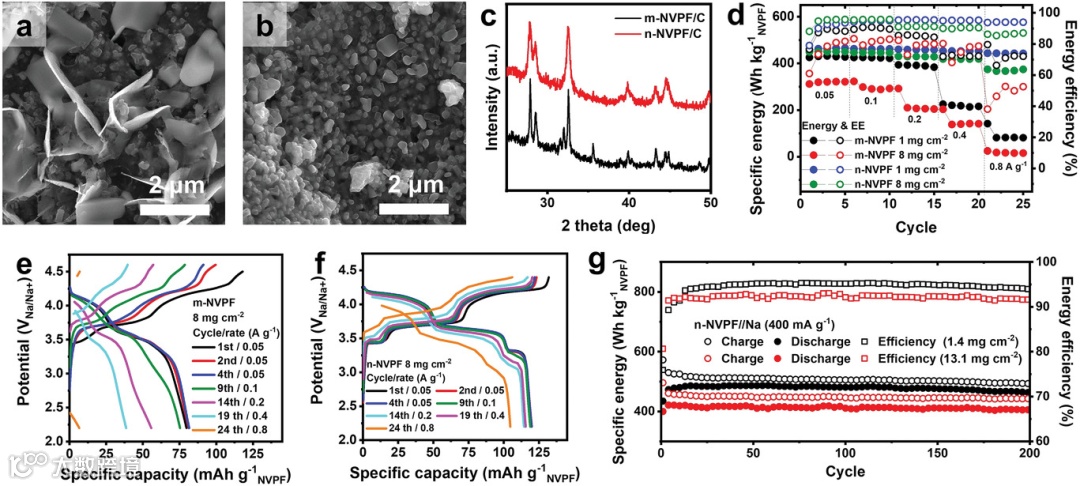 与m-NVPF相比,n-NVPF的电化学性能在钠离子容量、倍率性能和放电/充电电位方面都有显著提高(图1d-f),这归因于电化学反应动力学的增强。通过对m-NVPF到n-NVPF的简单结构修饰,容量和电位间隙分别从116 mAh g-1NVPF和0.17 V提高到124 mAh g-1和0.11V。在m-NVPF的情况下,当质量载荷从1 mg cm-2增加到8 mg cm-2时,在0.05 A g-1时,比能量和能量效率分别从432 Wh kg-1和90%下降到321 Wh kg-1NVPF和79%。