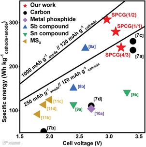 但是,由于钠离子的重量比锂离子大,SIBs的理论比能和实际比能都低于LIBs,因此在单位能量成本方面没有太大的效益。因此,开发大容量活性材料和设计高负载电极用于高能SIBs将是大规模储能装置的唯一选择,具有优异的性价比。要替代传统LIBs,SIBs的比能量必须接近300-400 Wh kg-1,这接近目前商业化的先进LIBs。