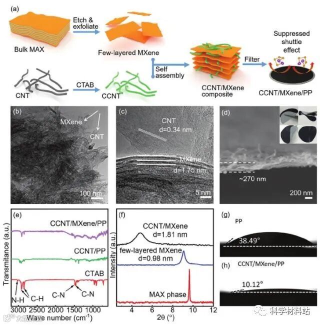 a) CCNT/MXene/PP隔膜合成示意图. b) CCNT/MXene复合物TEM图. c) CCNT/MXene复合物HRTEM图. d) of CCNT/MXene/PP隔膜SEM截面图和折叠/恢复测试 (插图). e) CTAB, CCNT/PP隔膜和CCNT/MXene/PP 隔膜红外光谱图. f) MAX相, 少层 MXene 纳米片和CCNT/MXene复合物XRD图谱. g,h) PP and CCNT/MXene/PP隔膜的电解液浸润实验。