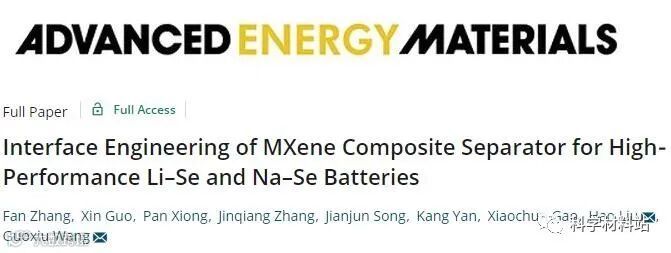 近日,澳大利亚悉尼科技大学汪国秀教授课题组在国际知名期刊Advanced Energy Materials(2018影响因子:24.88)上发表题为“Interface Engineering of MXene Composite Separator for High-Performance Li-Se and Na-Se Batteries”的研究工作。该工作开发了一种新型的自组装MXene复合物(CCNT/MXene/PP)隔膜,该隔膜可以明显改善隔膜-电解质界面特性,并有效抑制了穿梭效应。该文章第一作者为博士研究生张凡,刘浩副教授为共同通讯。