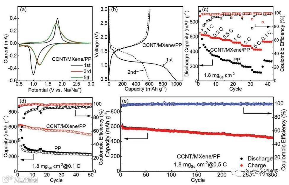 a)CCNT/MXene/PP隔膜电池在0.5-3V电压范围内的CV曲线,b)CCNT/MXene/PP隔膜电池的第一、二次放电-充电曲线。c) 采用PP和CCNT/MXene/PP隔膜的电池的倍率性能。d) PP和CCNT/MXene/PP隔膜在0.1C下的电池循环性能e)CCNT/MXene/PP隔膜在0.5C下的电池循环性能。
