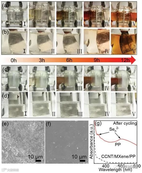 实验使用H型电池(图3a-d)进行原位充放电渗透实验,直观地观察到穿梭效应(使用PP隔膜,图3a)和抑制的穿梭效应(使用CCNT/MXene/PP隔膜,图3c)。