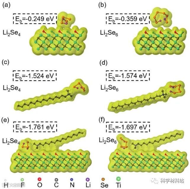 通过第一性原理计算和相应的结合能,优化的Li2Se4、Li2Se6模型与a,b)MXene、c,d)CTAB和e,f)CTAB–MXene相互作用的分子模型。