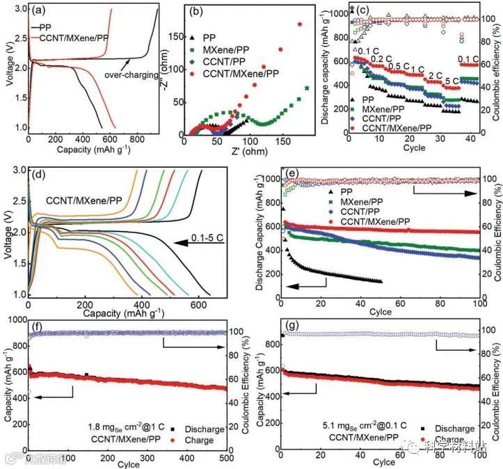 使用不同隔膜Li-Se电池的电化学性能。a)不同隔膜电池在0.1C时的第二圈充放电曲线。b)不同隔膜电池循环前的EIS图谱。c) 不同隔膜倍率性能。d) CCNT/MXene/PP隔膜电池的相应倍率充放电曲线。e) 不同隔膜电池的循环性能和0.1C库仑效率。f) CCNT/MXene/PP隔膜在1C下500次循环长期循环稳定性。g)CCNT/MXene/PP电池在0.1C时高硒面积质量负载为5.1 mg cm-2下100次循环的循环稳定性。