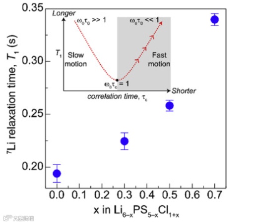 图5. 作为离子迁移率的指标的Li6-xPS5-xCl1 + x的7Li NMR T1弛豫时间