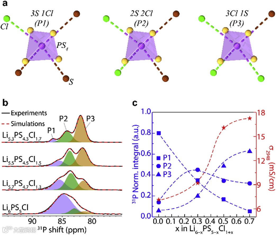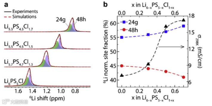 (b) Normalized Li site fractions and ionic conductivity in Li6−xPS5−xCl1+x (x = 0, 0.3, 0.5, and 0.7).