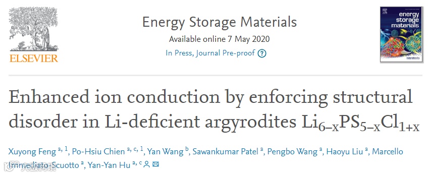 高导电固体电解质中,2008年报道的argyrodites(Li6PS5X,X = Cl,Br,and I)由于Li+迁移率异常高,可达到10-2 S/cm的离子导电率。在过去的十年中,所报道的辉绿岩(Li6PS5X)的电导率可达数mS/cm。泥晶石的离子导电性受缺陷和无序的影响很大。在完全有序结构中,卤化物X-离子占据空间群的4a位(0,0,0),而自由S2-占据4d位(0.25,0.25,0.75)。对于X = Cl和Br,自由的S2–(4d)和X–可以交换,导致明显的无序,而这种交换很少发生在X = I。此外,X的化学性质也影响Li6PS5X结构在48h和24g位置的锂离子分布,这对离子传导有很大的影响。