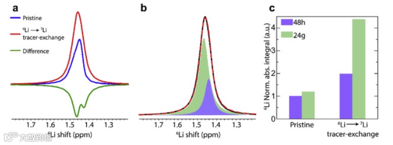 Detection of ion transport pathways in Li6PS5Cl with 6Li → 7Li tracer-exchange NMR. (a) 6Li NMR spectra before/after tracer exchange. The difference spectrum shows both Li sites are 6Li enriched.