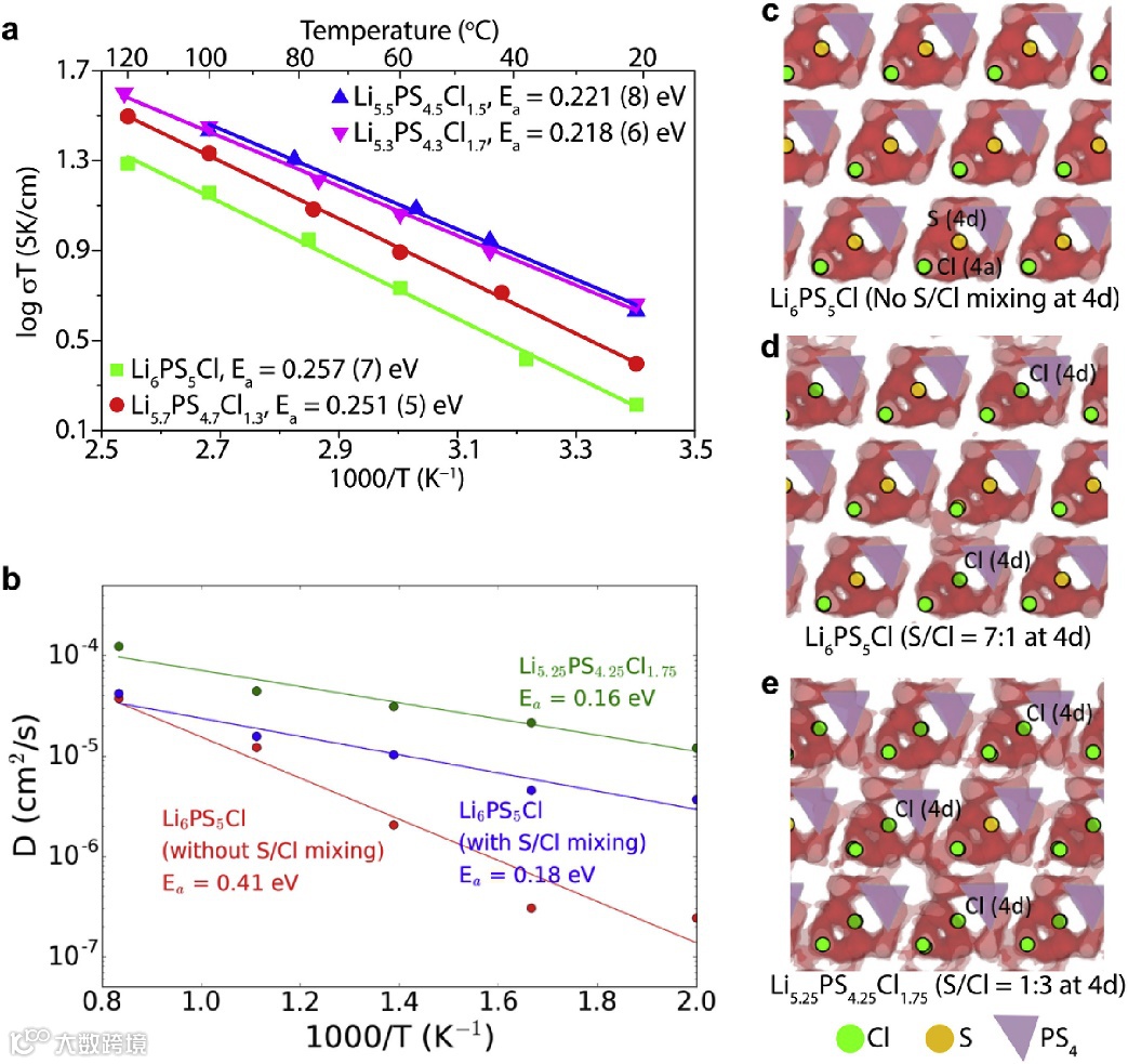 (c–e) The Li-ion probability densities of Li6PS5Cl (without S2−/Cl− mixing at 4d sites), Li6PS5Cl (with S2−/Cl− mixing 7:1 at 4d sites), and Li5.25PS4.25Cl1.75 (S2−/Cl− mixing 1:3 at 4d sites). The probability densities of Li ions are obtained from AIMD simulations at 600 K with 100 ps, and the isosurfaces are plotted at isovalues of the mean value of the density. The Li atoms inside the Li(S/Cl)4 tetrahedrons (48h sites), P (4b sites) and S (16e sites) atoms in the PS4 tetrahedra are not shown for a clear view of the sites of interest.