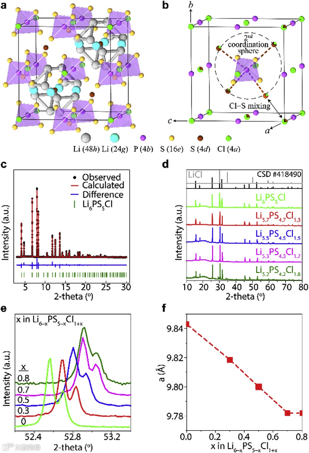 (f) The lattice parameters are obtained from refinement of PXRD patterns in (d) as a function of x in Li6−xPS5−xCl1+x.
