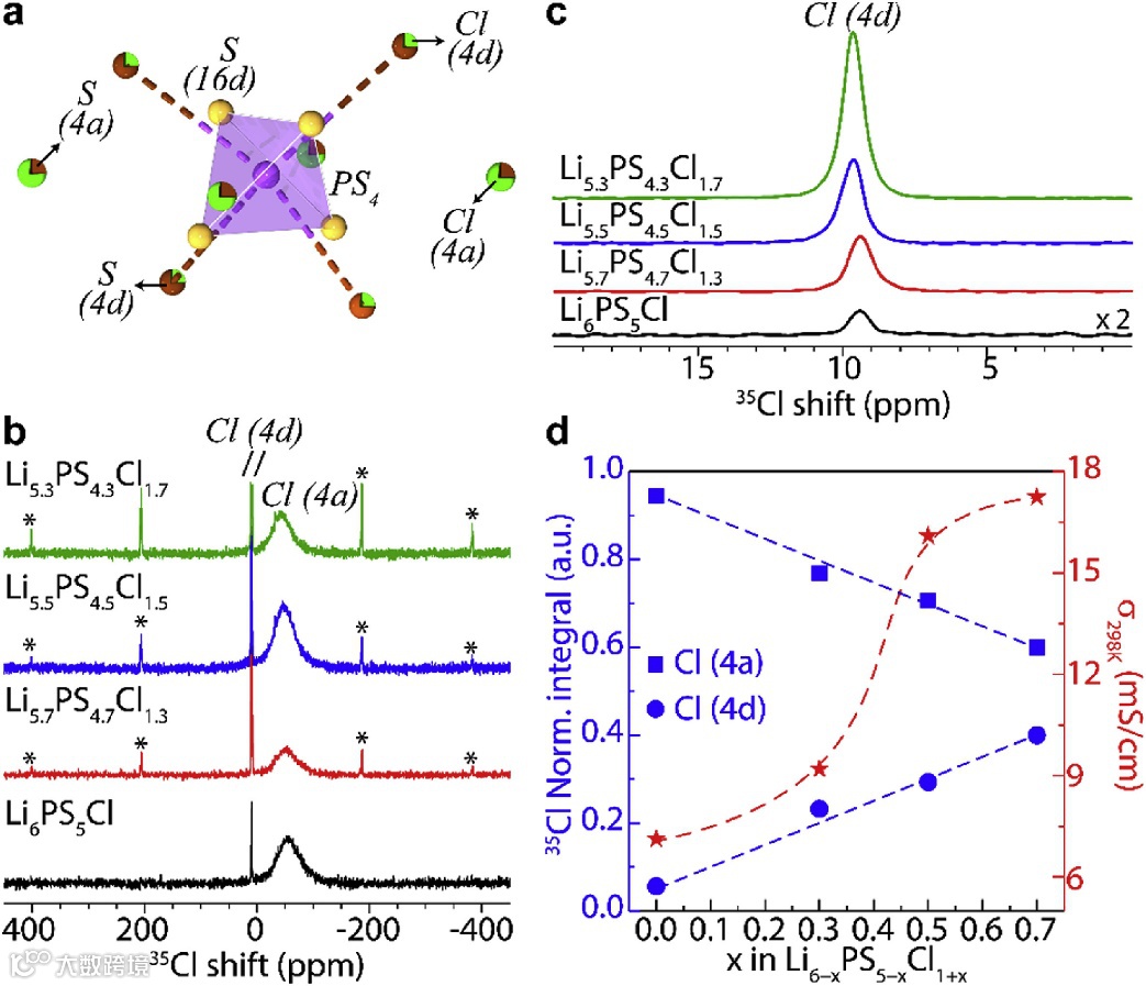 (a-c) The schematic of S2−/Cl− mixing at 4d/4a sites. 35Cl NMR spectra showing Cl at 4a site and 4d site (* presents the side bands of 4d peak) in Li6−xPS5−xCl1+x, x = 0, 0.3, 0.5, and 0.7.