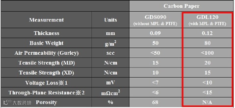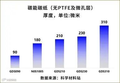 对于疏水碳纸,台湾碳能在出厂时就有做疏水处理和微孔层处理,这一点很好的满足了燃料电池用户的需求,该系列(GDL)产品每种型号对应厚度都比GDS系列产品增加30微米,Z博士猜测GDL系列的碳纸有可能是直接在GDS系列的碳纸上涂以PTFE和微孔层获得的(有待考证),之后的材料科普中我们会介绍PTFE和微孔层的涂覆工艺。