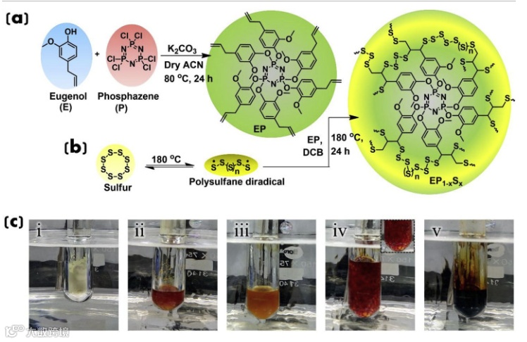 (c) digital images during synthesis of EP10S90 at different stages- (i) sulfur at room temperature, (ii) polymeric sulfur radical at 180 °C, (iii) addition of EP in polymeric S at 180 °C, reaction mixture (iv) after 30 min (inset shows a zoom-in image indicating liberation of H2S leading to volume expansion and successful co-reaction) and (v) after completion of reaction, 24 h (drastic colour change and no bubble formation indicates completion of reaction). (For interpretation of the references to colour in this figure legend, the reader is referred to the Web version of this article.)