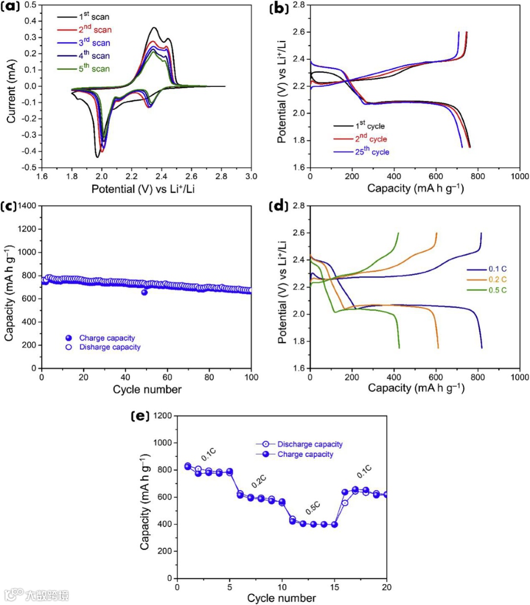 (e) rate performance at different current rates.