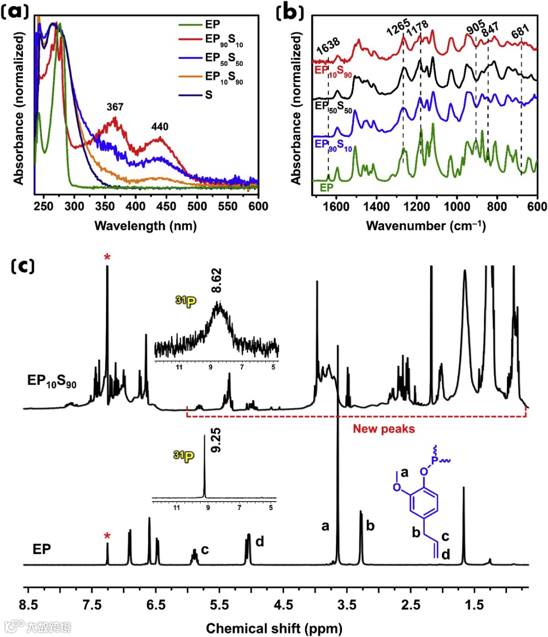 (b) FTIR spectra of EP and different EP1-xSx copolymers (normalized at PN at 1265 cm−1);