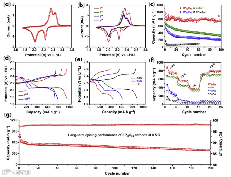作者所设计的共聚物具有良好的阻燃性能,同时对极性和杂原子骨架的多硫化锂具有良好的吸附性能。此外,非晶态共聚物骨架可以减缓嵌锂/脱锂过程中的体积膨胀。这有望保持电池的结构完整性,以获得稳定的性能。采用碳布作为集电器来解决活性材料的电阻率问题。这消除了通常需要添加外部导电纳米填料的需求,从而提供了一种更简单、经济的制造方法。目前的工作涉及一个可持续的易用材料设计的阴极,以减轻可燃性问题,而不影响锂-硫电池的性能。