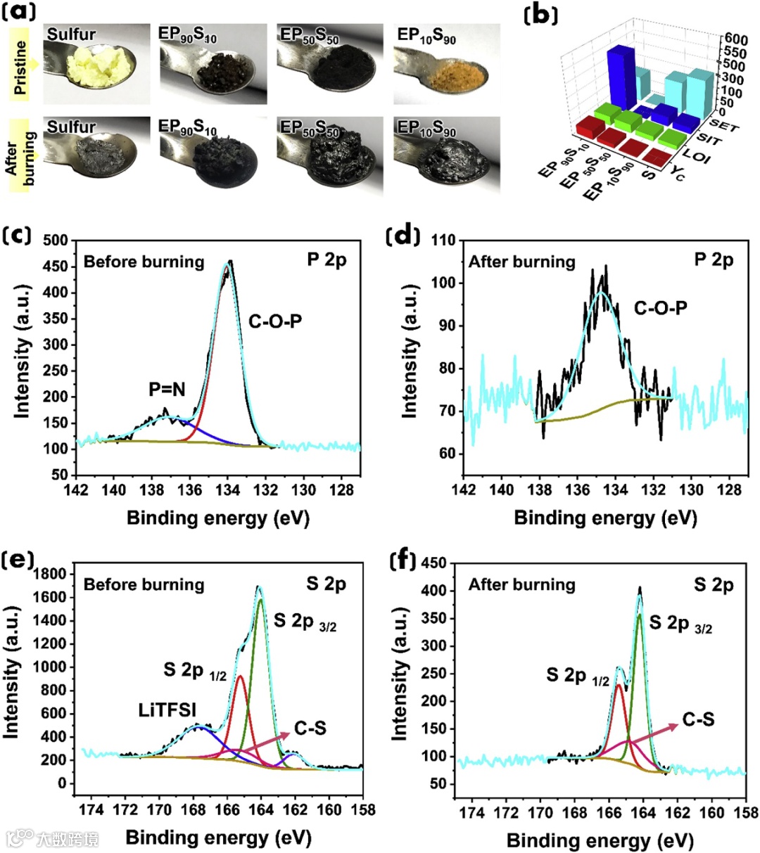 (e, f) high-resolution S 2p XPS spectra of EP50S50 electrode before (e) and after burning (f).