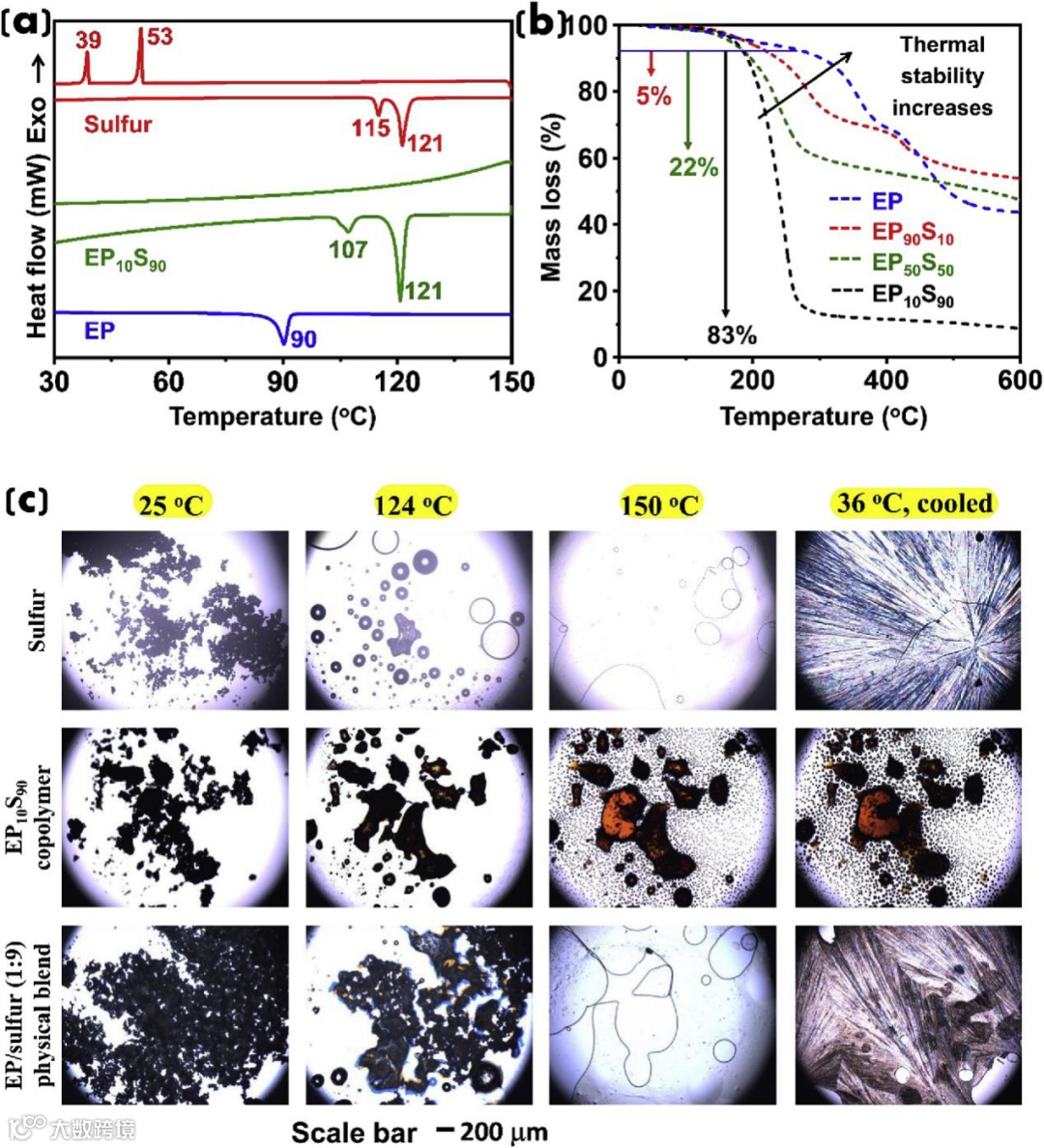 (a) DSC thermograms of sulfur, EP10S90 and EP, with heating and cooling cycle;