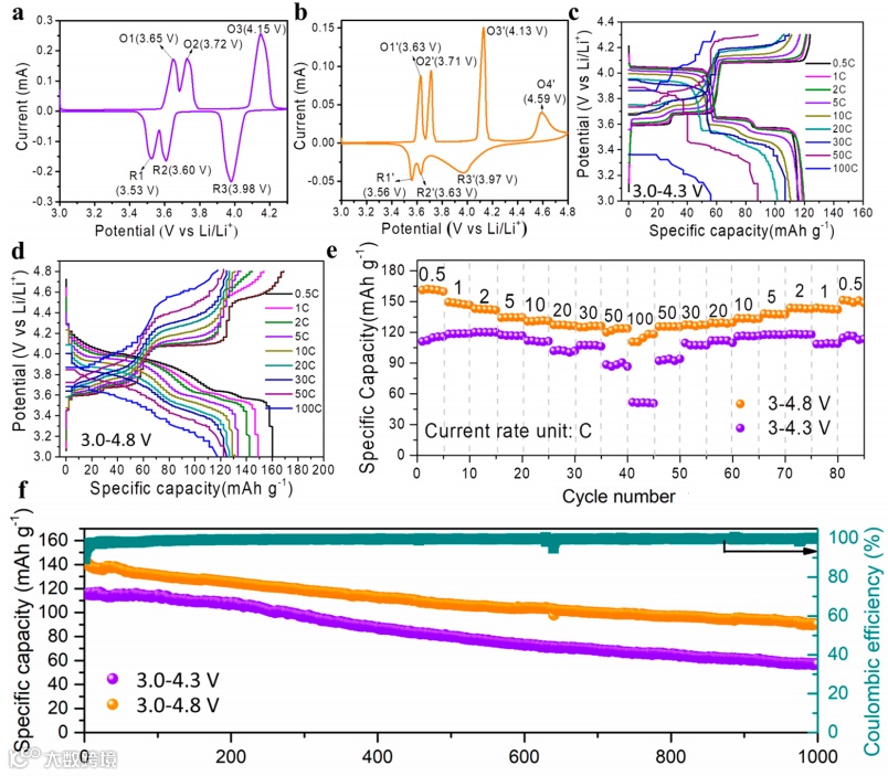 (a) 3.0−4.3 and (b) 3.0−4.8 V. GCD profiles at various current rates: (c) 3.0−4.3 and (d) 3.0−4.8 V. (e) Rate performance of Li3V2(PO4)3 electrodes at different CoVs. (f) Cycling performance of Li3V2(PO4)3 electrodes at a current rate of 1 C (1 C = 133 mA g−1 , corresponding to a two-electron transfer).