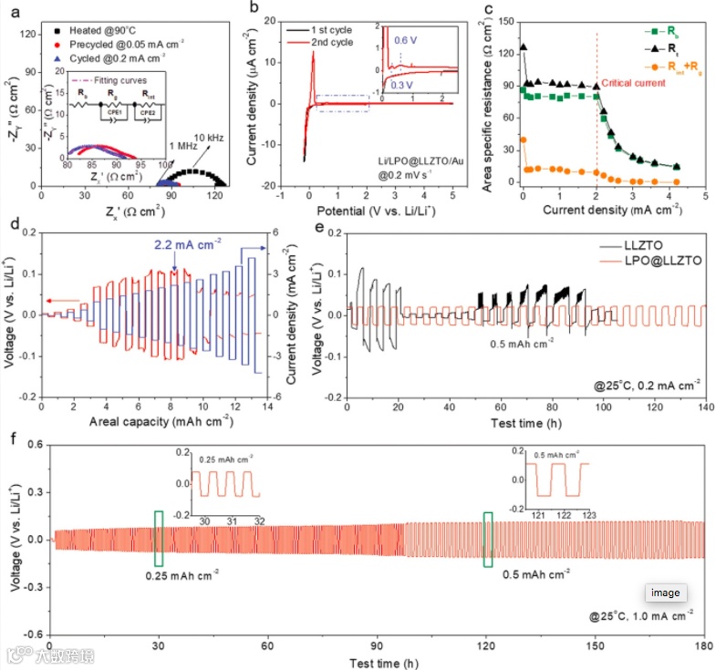f) Galvanostatic cycling of Li/LPO@LLZTO/Li cell with a current density of 1.0 mA cm−2; the cell was precycled at 0.05 mA cm−2.