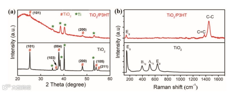 b) Raman spectra of pure TiO2NTs and TiO2/P3HT hybrid.