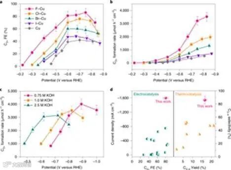 d. A comparison of some typical electrocatalytic and thermocatalytic systems reported so far (see Supplementary Tables 2 and 3 for details). The squares and circles in Fig. 1d represent the electrocatalytic reactions conducted in an H-shape cell and flow cell, respectively. The triangles in Fig. 1d represent the thermocatalytic reactions. The experiments in each case were performed in triplicates and the results are shown as mean ± s.d.