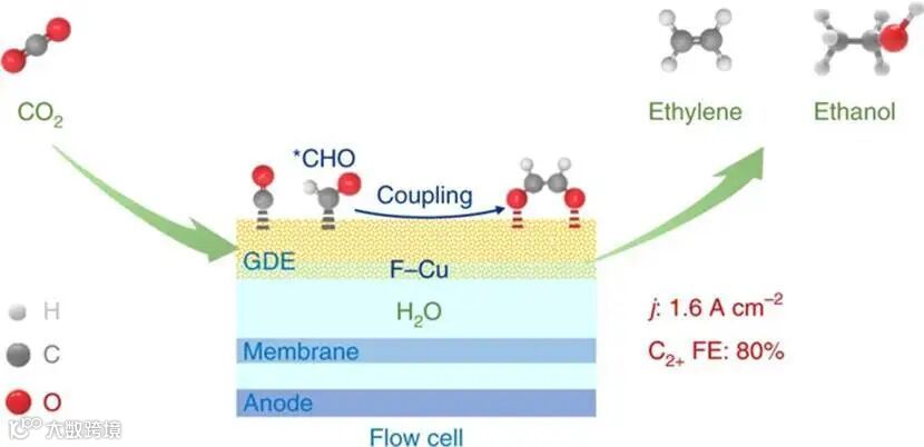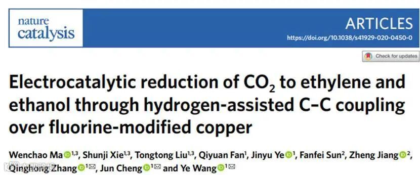 本文报道了一种氟改性的铜催化剂,在电催化CO2还原装置中,该催化剂表现出1.6 A cm-2的超高电流密度,其中C2+(主要是乙烯和乙醇)的法拉第效率高达80%。进一步发现,C2-4产物的选择性和单循环收率分别达到85.8%和16.5%,超过了大量关于CO2热催化加氢产C2-4产物的文献中的性能。揭示了在被吸附的CHO中间产物之间形成C2+的氢辅助C-C键耦合机制。而氟改性进一步增强了水活化,CO吸附以及被吸附的CO氢化成CHO中间体的能力,使得CHO中间体容易发生偶联。