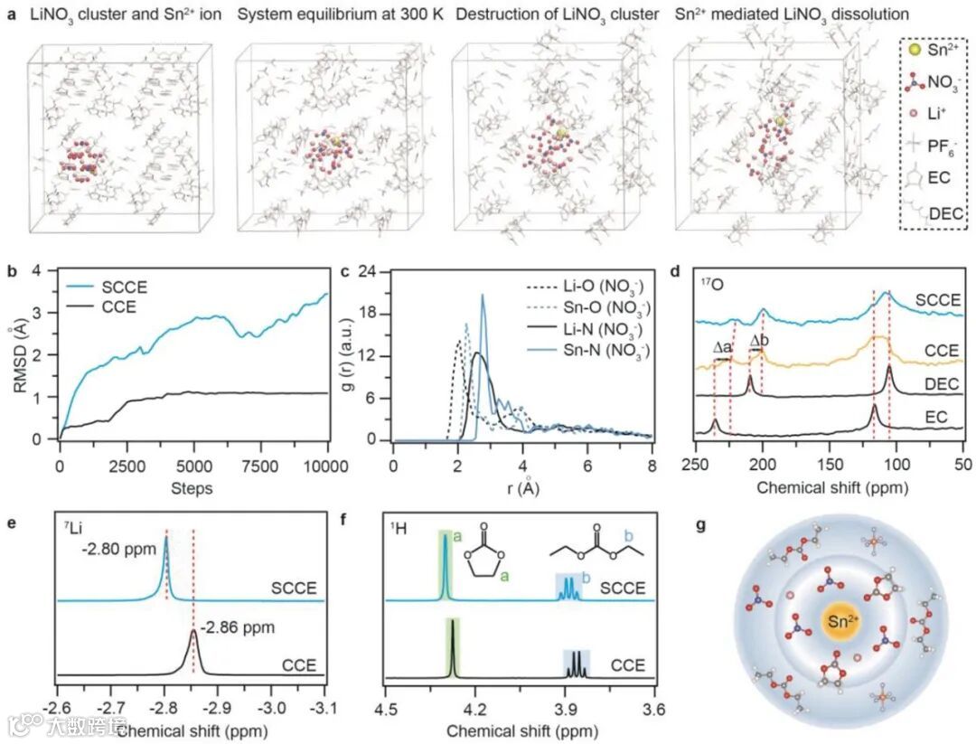 c) The RDFs of Li+–NO3− and Sn2+–NO3− in 1 m LiPF6 EC/DEC.