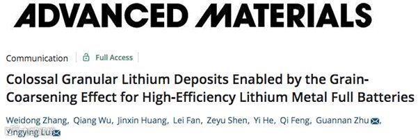 为此, 浙江大学陆盈盈教授和上汽集团朱冠楠在国际知名期刊Advanced Materials上发表了题为 “Colossal Granular Lithium Deposits Enabled by the Grain‐Coarsening Effect for High‐Efficiency Lithium Metal Full Batteries”的研究性文章, Weidong Zhang是本文的第一作者。