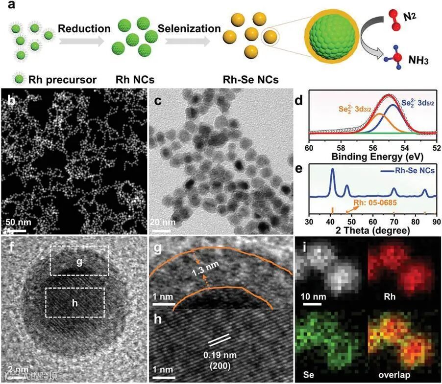 g,h) the magnified regions in (f), and i) HAADF‐STEM image and elemental mappings of Rh‐Se NCs.