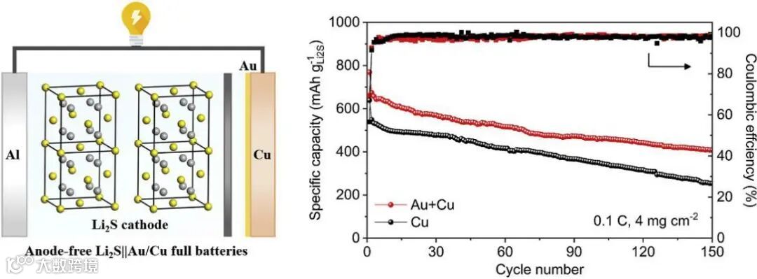 作者展示了一个以Li2S为正极、Au改性铜箔为空负极集流体的无负极全电池,可实现高达626 Wh kg -1的能量密度。改性Au(0.168 mg cm-2,$∼0.008 cm -2)将转变为LixAu合金和固溶体,成功地降低了Li沉积的成核势垒,诱导了无锂枝晶产生的形貌。结果表明,无负极Li2S | | Au/Cu全电池的初始库仑效率提高了69%,并且在150个循环中具有较高的循环稳定性。这项工作为实现具有更高的整体能量密度和极稳定的界面化学性质的真正的锂受限Li-S完整电池提供了一条新途径