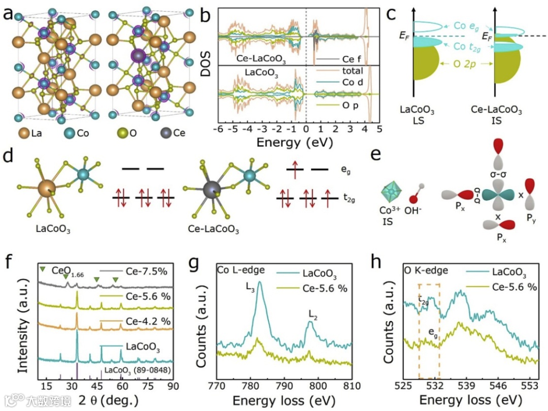 (e) Schematic representation of interaction between Co3+ and OH* for Ce-doped LaCoO3.