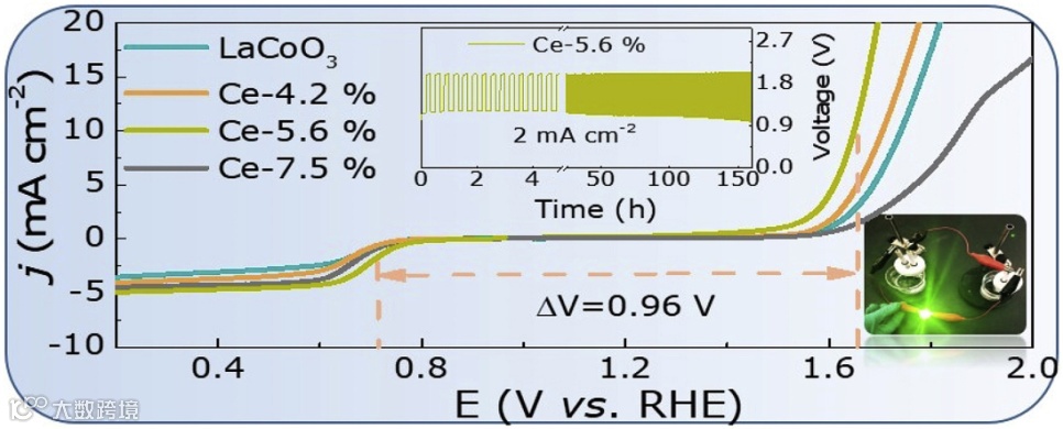 5.6 at. % Ce掺杂LaCoO3(Ce-5.6%)具有优异的双功能(OER和ORR)电催化活性和稳定性。