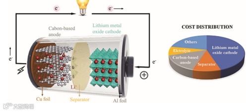 图1. 商业LIBs结构示意图及各组成部分的相应成本比例。