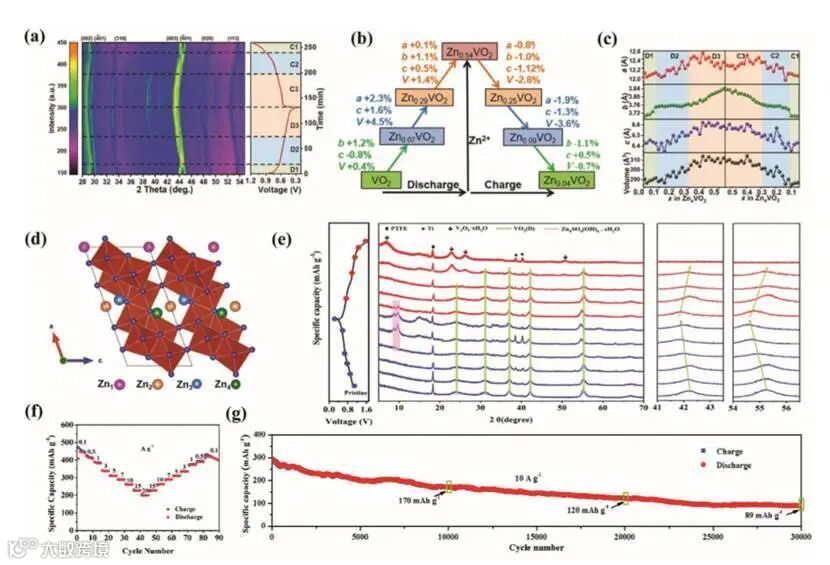 a) In situ XRD patterns of VO2(B) cathode during the first cycle at 0.1 A g–1, consisting of three stages: D1 and C1 (green), D2 and C2 (blue), and D3 and C3 (orange).