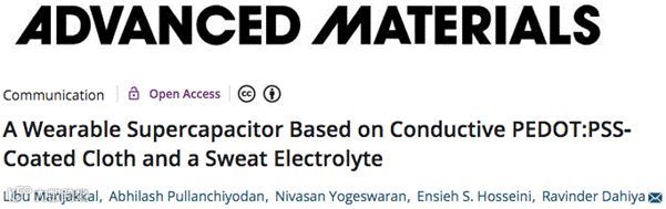 近日, 格拉斯哥大学Ravinder Dahiya教授课题组在国际知名期刊Advanced Materials上发表了题为“A Wearable Supercapacitor Based on Conductive PEDOT:PSS‐Coated Cloth and a Sweat Electrolyte”的论文, Libu Manjakkal 是本文的第一作者。