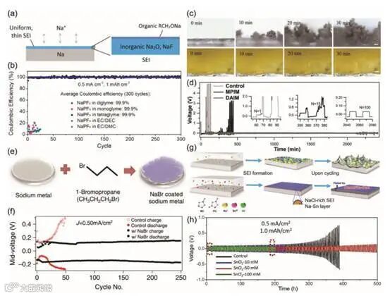 f) voltage hysteresis represented by mid-voltage value for NaBr coated and control sodium cells. g) SEI formation in a carbonate electrolyte (upper part) and with SnCl2 additive (lower part), and h) cycle performance with different concentrations of SnCl2.
