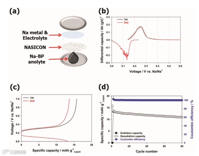 a)Schematic illustration of the cell setup for the electrochemical characterization of Na-BP as liquid active material in half-cell configuration with a sodium metal counter electrode and a layer of NASICON as solid electrolyte to physically separate the two electrodes.