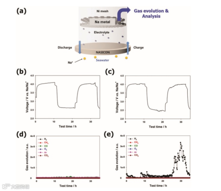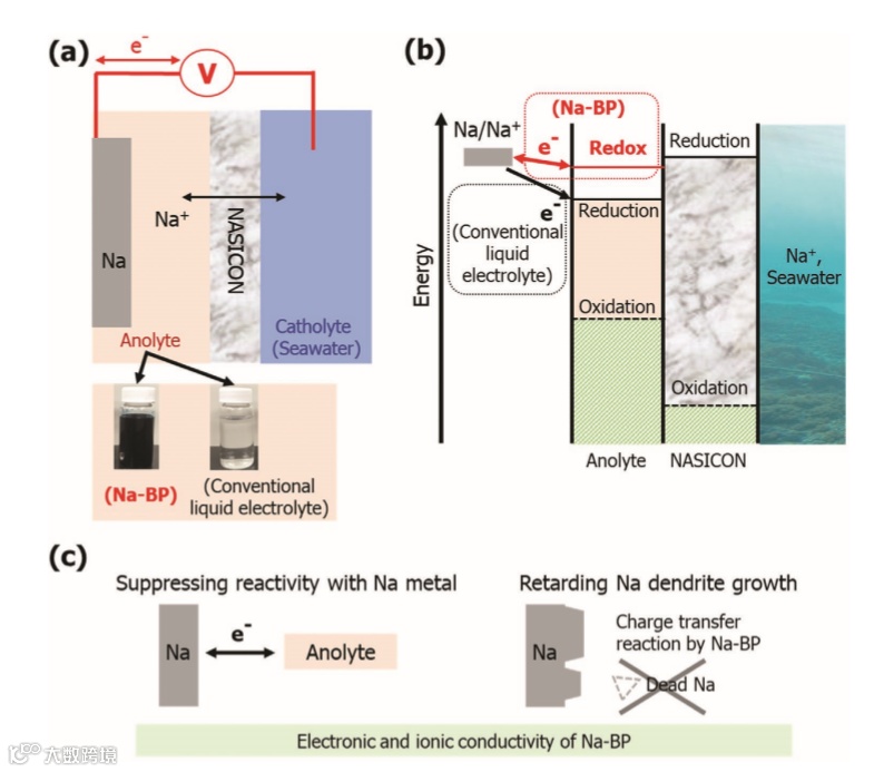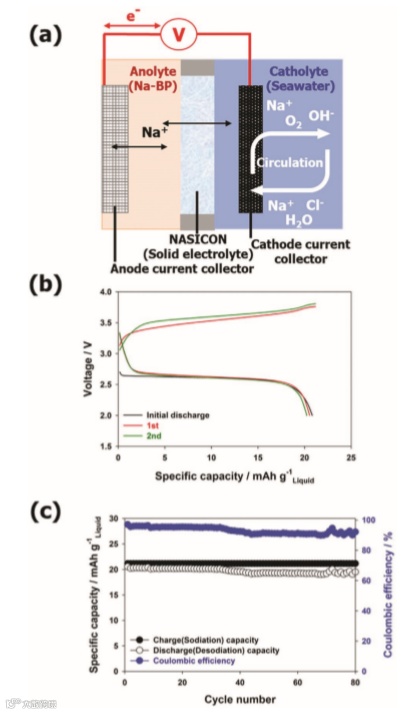 a) Schematic illustration of the cell setup for seawater-battery full-cells employing the Na-BP solution as anolyte and seawater as catholyte. The electrodes are physically separated by a NASICON solid electrolyte layer and nickel foam and carbon felt are serving as current collector for the anode and cathode, respectively.