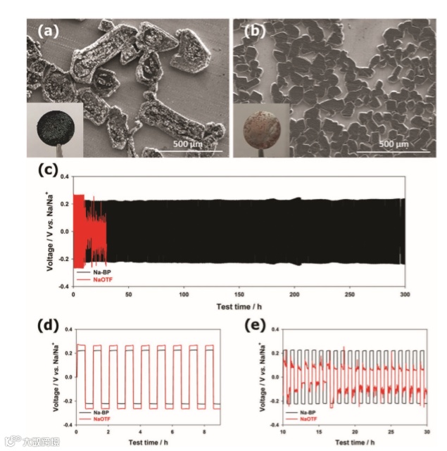 c) Sodium stripping/plating experiments for symmetric Na|anolyte /electrolyte| NASICON|anolyte /electrolyte |Na cells employing either Na-BP in DEGDME (in black) or 1 m NaOTF in TEGDME (in red) at a current density of 1 mA cm−2 with a stripped/plated capacity of 0.5 mAh cm−2 for each step. d,e) Magnification of the