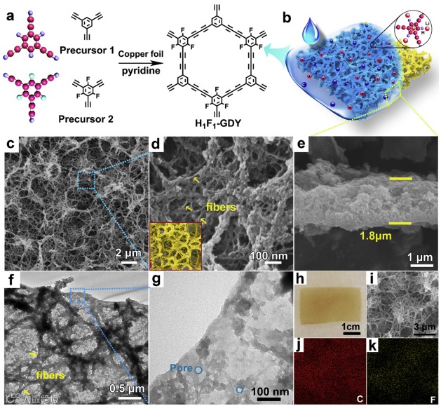 (a) The schematic diagram of preparation for H1F1-GDY and the ball-and-stick model of two precursors. (b) Structural schematic diagram of H1F1-GDY and the advantages of H and F doped. (c–d) SEM images of H1F1-GDY from top view, inset of d: the structural model of H1F1-GDY. (e) SEM image of H1F1-GDY from side view. (f–g) TEM images of H1F1-GDY at different resolution. (h) The real photograph of H1F1-GDY. (i–k) The elemental mapping of H1F1-GDY.