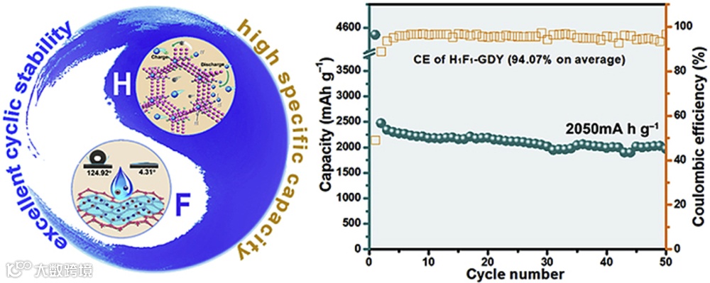 稳定的固体电解质界面(SEI)膜和氟化物形成的强C-F键能有效地提高LIBs的循环稳定性。此外,含氢碳材料的有效储锂提高了比容量。本文提出了一种H和F定位平衡共掺杂GDY的策略,结合H和F元素的锂存储贡献,实现了锂离子电池超高容量和稳定性。当H和F均匀共掺杂时,可以形成纤维网状多孔结构,并与SEI膜产生良好的电解质渗透和界面稳定性。这项工作提供了界面结构调整的方法,有效地提高了锂的储存稳定性。