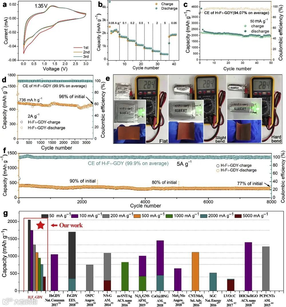(a) The cyclic voltammetry test at 0.1 mV s−1. (b) Rate performance at gradually increase rates ranging from 0.05 to 5 A g−1. (c) The cycle performance at 50 mA g−1. (d) The stability of H1F1-GDY at 2 A g−1. (e) The flexible test of H1F1-GDY as electrode in soft package LIB. (f) The cycle performance of H1F1-GDY at 5 A g−1. (g) The performance of H1F1-GDY compared with some electrodes reported recent years.